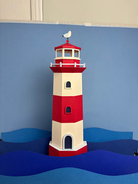 I created a playful nautical paper world complete with Chamberlain Coffee bags jumping out of the water and a tiny Emma Chamberlain crossing the seas.